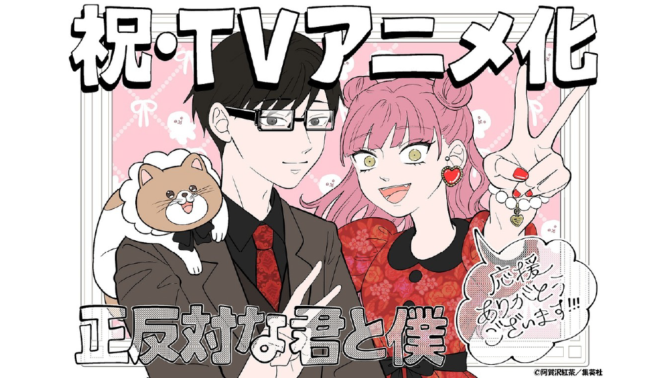 Koucha Agasawan romanttinen komediamanga You and I Are Polar Opposites (Seihantai na kimi to boku) saa animen talvikaudella 2026. Tuotantostudioksi sarjalle on varmistunut Lapin Track -niminen animestudio, jolle tämä tulee olemaan ensimmäinen isompi tuotantoprojekti sitten Endriden animesovituksen vuodelta 2016. Itse tuotantotiimistä ei ole vielä annettu lisätietoja.